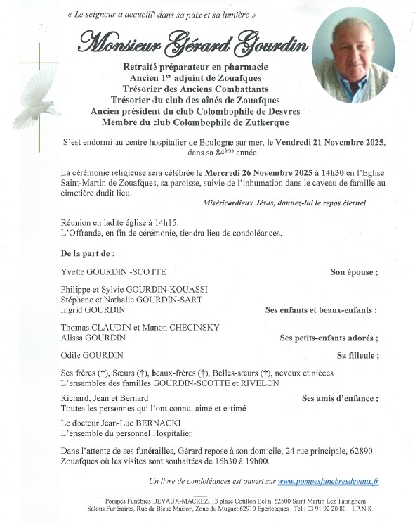 C’est avec une grande tristesse que nous vous annonçons le décès de Gérard GOURDIN survenu le vendredi 21 novembre 2025 à Boulogne-sur-Mer. La cérémonie se déroulera le mercredi 26 novembre 2025 à 14h30 à l’adresse suivante : Église Saint Martin - 62890 Zouafques.