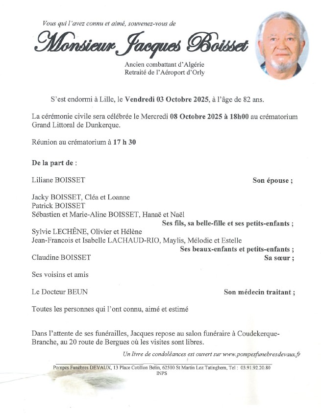 C’est avec une grande tristesse que nous vous annonçons le décès de Jacques BOISSET survenu le vendredi 03 octobre 2025 à Lille.