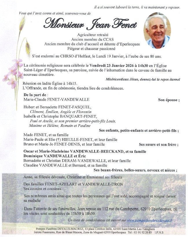 C’est avec une grande tristesse que nous vous annonçons le décès de Jean FENET survenu le lundi 19 janvier 2026 à Helfaut. La cérémonie se déroulera le vendredi 23 janvier 2026 à 14h30 à l’adresse suivante : Église Saint Léger - 62910 Éperlecques.