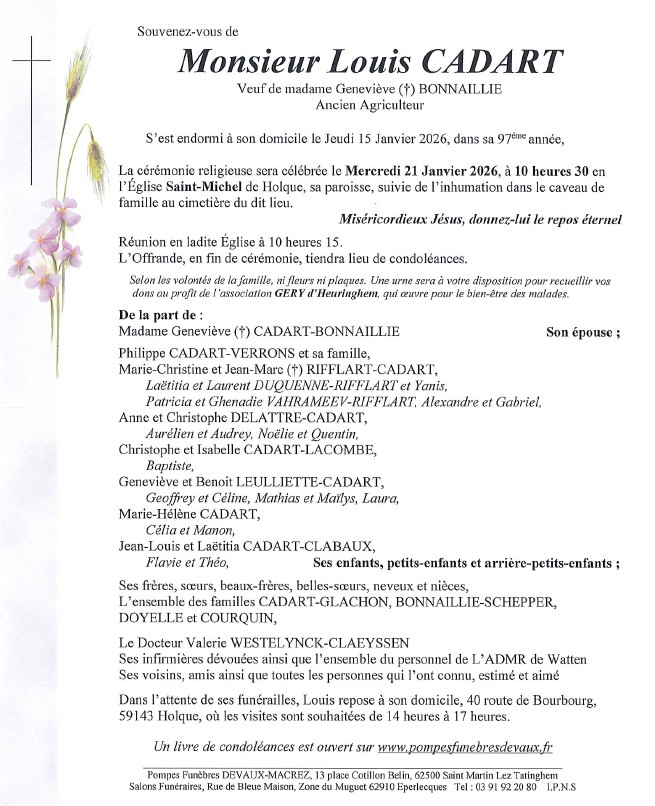 C’est avec une grande tristesse que nous vous annonçons le décès de Louis CADART survenu le jeudi 15 janvier 2026 à Holque. La cérémonie se déroulera le mercredi 21 janvier 2026 à 10h30 à l’adresse suivante : Église Saint Michel - 59143 Holque.