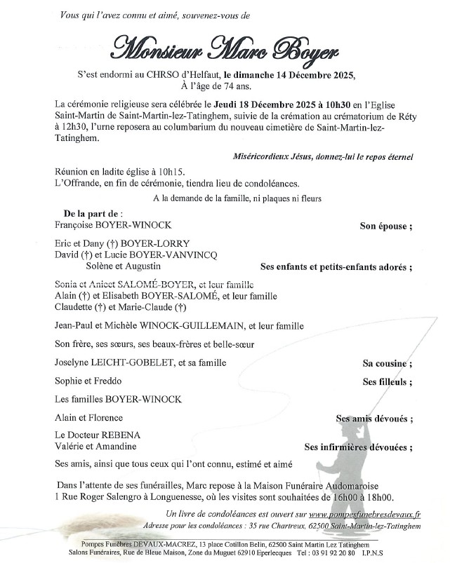 C’est avec une grande tristesse que nous vous annonçons le décès de Marc BOYER survenu le dimanche 14 décembre 2025 à Helfaut.