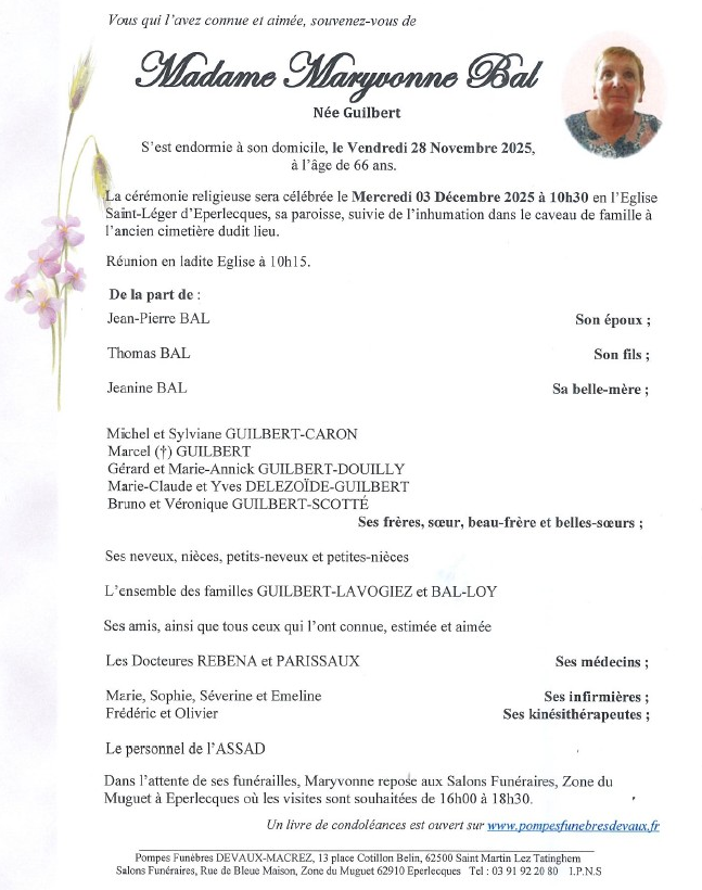 C’est avec une grande tristesse que nous vous annonçons le décès de Maryvonne BAL survenu le vendredi 28 novembre 2025 à Éperlecques. La cérémonie se déroulera le mercredi 03 décembre 2025 à 10h30 à l’adresse suivante : Église Saint Léger - 62910 Éperlecques.