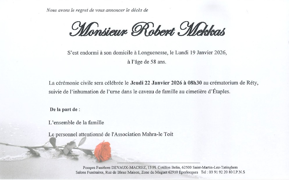 C’est avec une grande tristesse que nous vous annonçons le décès de Robert MEKKAS survenu le lundi 19 janvier 2026 à Saint-Martin-lez-Tatinghem. La cérémonie se déroulera le jeudi 22 janvier 2026 à 08h30 à l’adresse suivante : Crématorium de Rety - Rue Victor Hugo Rety - 62720 Rety.