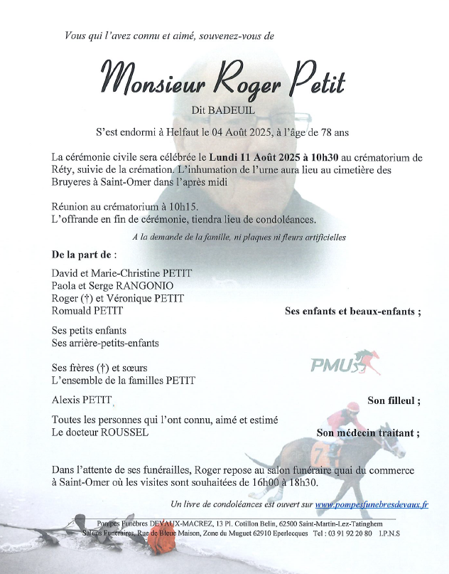 C’est avec une grande tristesse que nous vous annonçons le décès de Roger PETIT survenu le lundi 04 août 2025 à Helfaut.