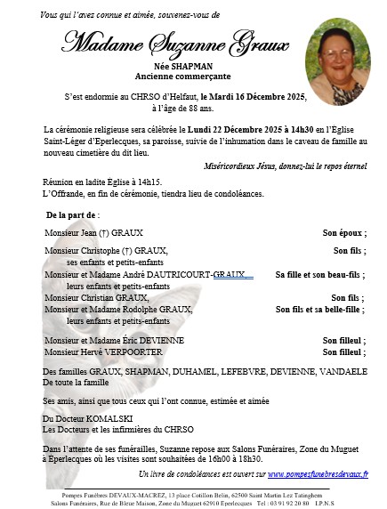 C’est avec une grande tristesse que nous vous annonçons le décès de Suzanne GRAUX survenu le mardi 16 décembre 2025 à Helfaut. La cérémonie se déroulera le lundi 22 décembre 2025 à 14h30 à l’adresse suivante : Église Saint Léger - 62910 Éperlecques.